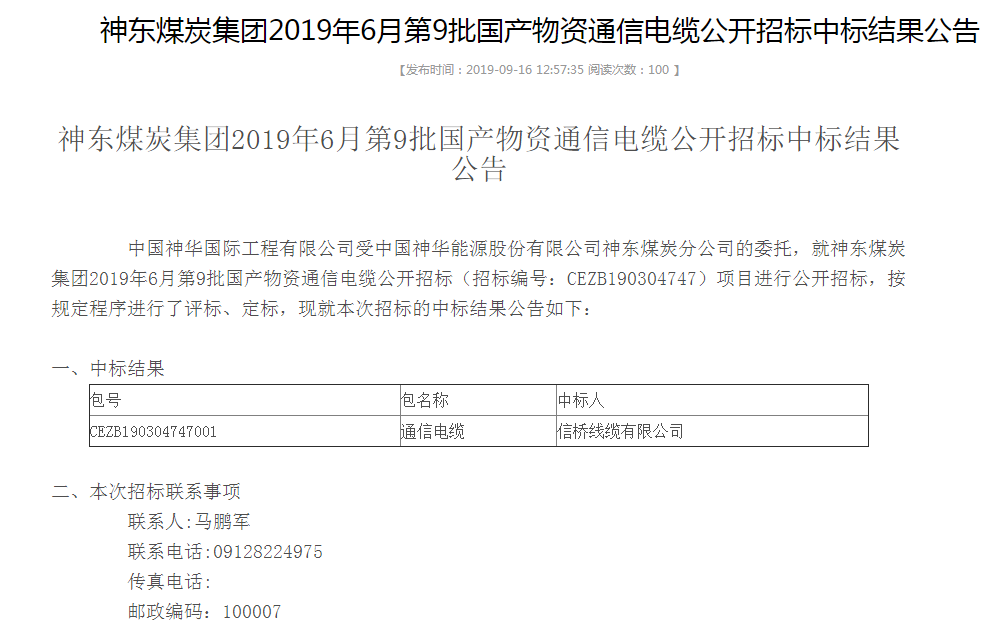點擊數:62512019-11-21 00:00:00 來源: 神東煤炭集團2019年6月第9批國產物資通信電纜公開招標中標結果公告